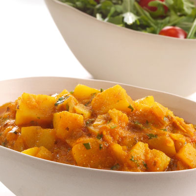 | Stukjes gekruide aardappel met ui, tomaat en verse koriander