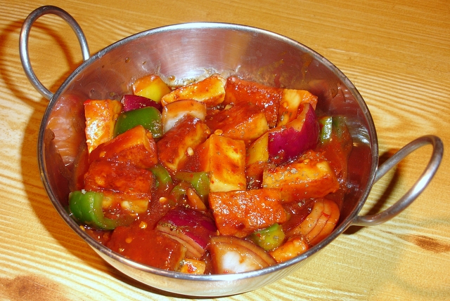 | Kip/lamsvlees uit de tandoori in een curry met tomaten, ui en paprika (medium heet)