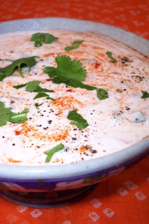 | Frisse, kruidige yoghurtsaus met tomaat, komkommer en mosterdzaad